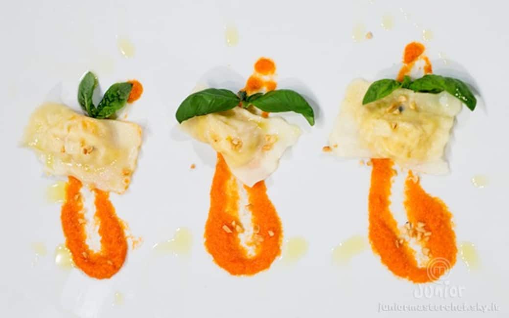 Mantecare con burro e granella di nocciole i ravioli. creare sul piatto 3 baffi di salsa di pomodoro e disporvi sopra un raviolo per baffo e decorare con una fogliolina di basilico per raviolo.