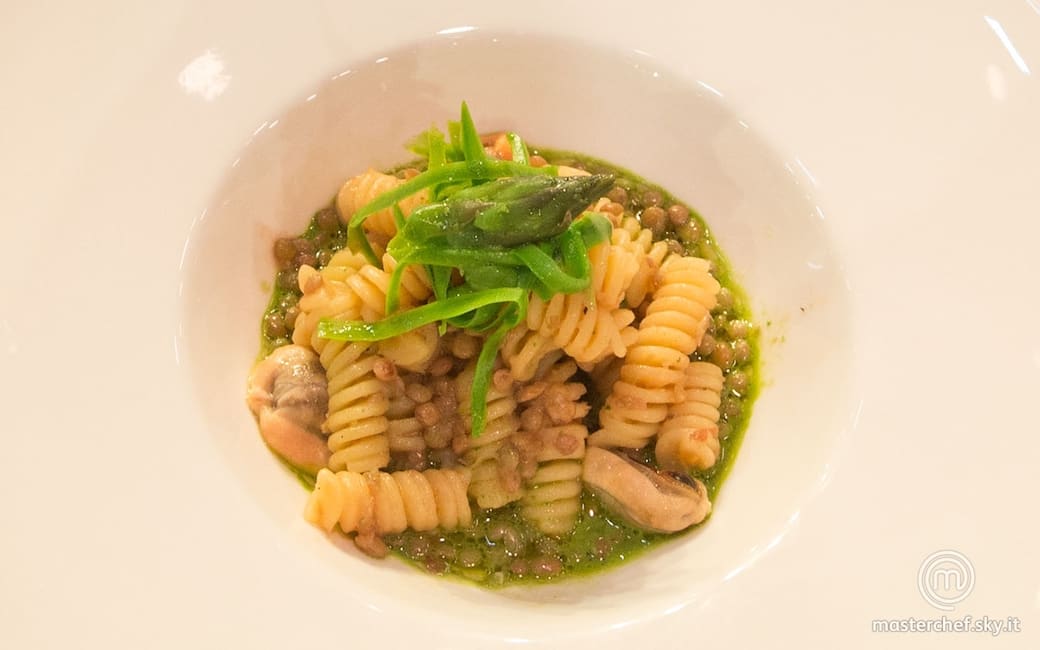 Portare a ebollizione l’acqua in una pentola e cuocere i fusilli. A metà cottura scolare e completarla risottando la pasta con l’acqua delle cozze, due cucchiai di acqua di pomodorino e la crema di lenticchie.