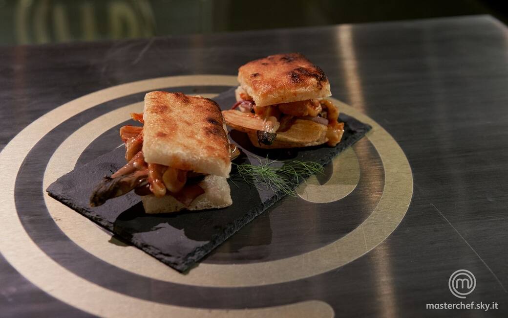 Comporre il panino sistemando il ragù di trippa alla base, le cipolle caramellate, le chips di patata e la melanzana. Completare con la salsa al caprino.