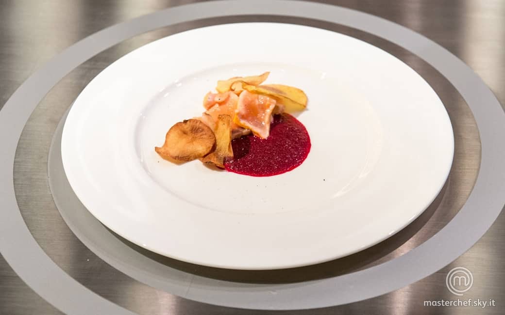 Impiattare disponendo sul fondo la crema di rapa rossa, al centro il salmone e sopra le chips di patate e topinambur. Regolare di sale e pepe.
