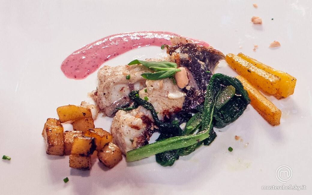 Impiattare disponendo la crema di fragoline, i tranci di anguilla, le carote e la borragine, le patate e una spolverata di mandorle tostate. Completare con qualche foglia di silene e con l’erba cipollina tritata. Aggiustare di sale e pepe.