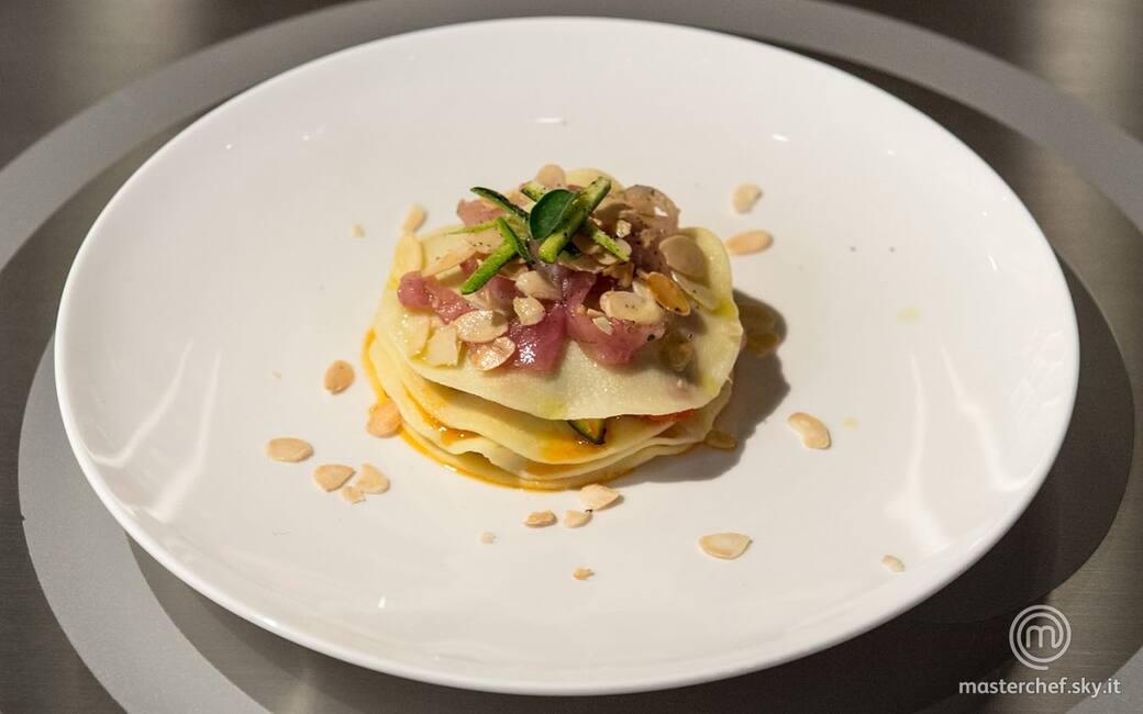 Impiattare alternando i dischi di pasta, il sugo di pomodorini e zucchine e il carpaccio di pesce spada. Terminare con un goccio di olio evo e le lamelle di mandorle tostate.