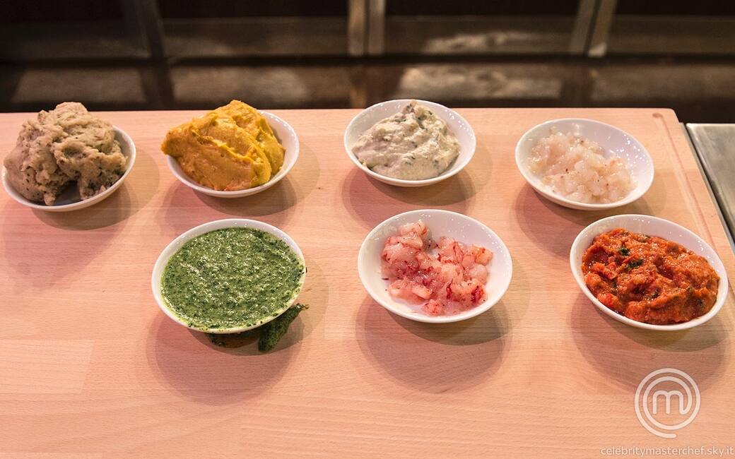 Per la farcia agli scampi: pulire accuratamente gli scampi, rimuovere la testa, il carapace e il filetto e tagliare la polpa a cubetti. tenere da parte. per la farcia ai gamberi: pulire accuratamente i gamberi, rimuovere la testa, il carapace e il filetto e tagliare la polpa a cubetti. marinarla con un filo di olio evo, una presa di sale e una macinata di pepe e tenere da parte.