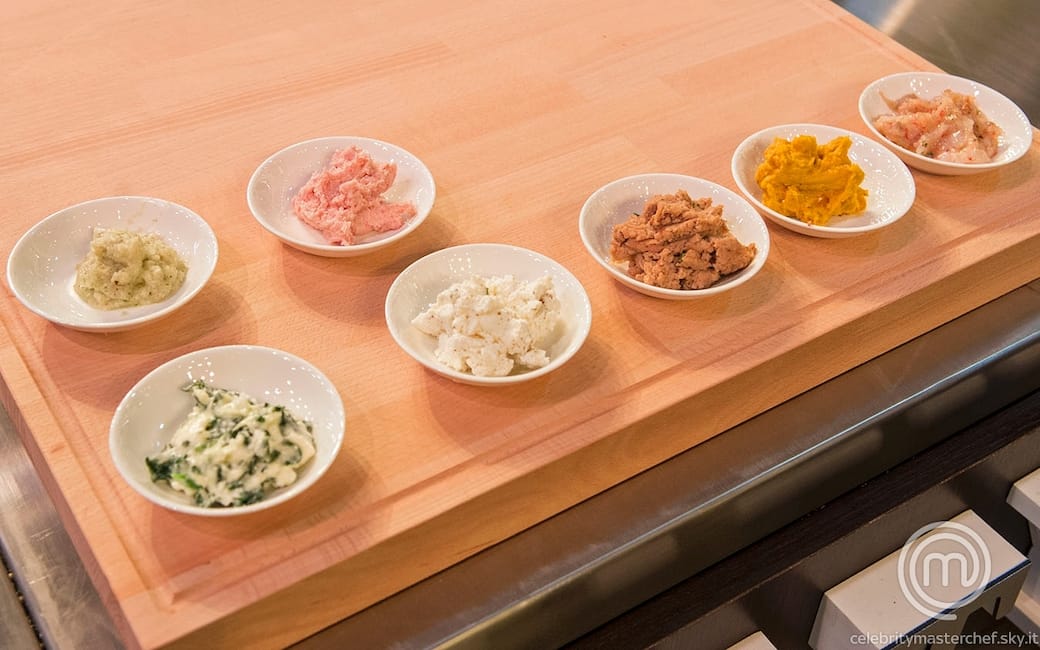 Per la farcia alla mortadella e al prosciutto: tagliare 80 grammi di mortadella e 80 grammi di prosciutto crudo a cubetti grossolani e frullarli al mixer con 60 grammi di parmigiano fino a ottenere un composto omogeneo. aggiustare di sale e pepe e tenere da parte. per la farcia con la carne di maiale e di vitello: tagliare a cubetti regolari le due carni e cuocerle in padella con un filo di olio evo e uno spicchio d’aglio. frullarle le carni al mixer insieme a 40 grammi di mortadella, 40 grammi di prosciutto crudo tagliati a cubetti grossolani e 60 grammi di parmigiano fino a ottenere un composto omogeneo. aggiungere un uovo, una presa di sale e una macinata di pepe e amalgamare lavorando con le mani. tenere da parte.