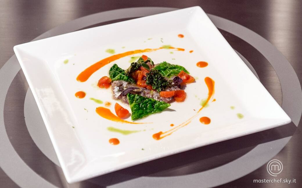 Impiattare disponendo la tartare di alici in un ring circolare e i pomodorini a cubetti sopra, delle virgole con l’acqua di verza e la salsa di pomodoro e la verza croccante per concludere.