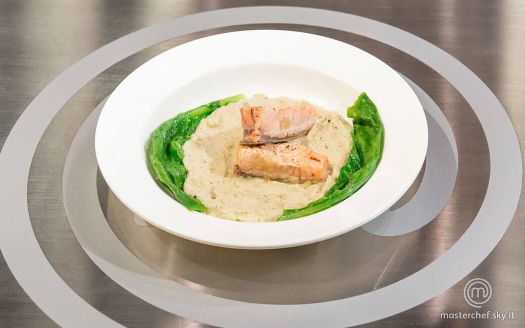 Impiattare versando sul fondo la crema di topinambur, al centro i filetti di salmone e sui bordi due foglie di rapa bianca.