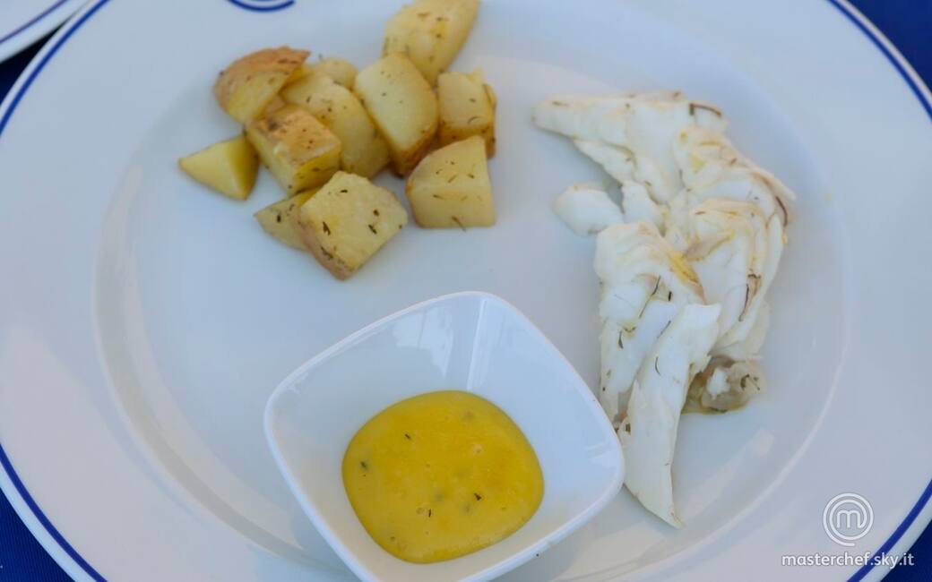 Impiattare disponendo dei tranci di lucioperca, una porzione di patate e una ciotola con la salsa bernese.