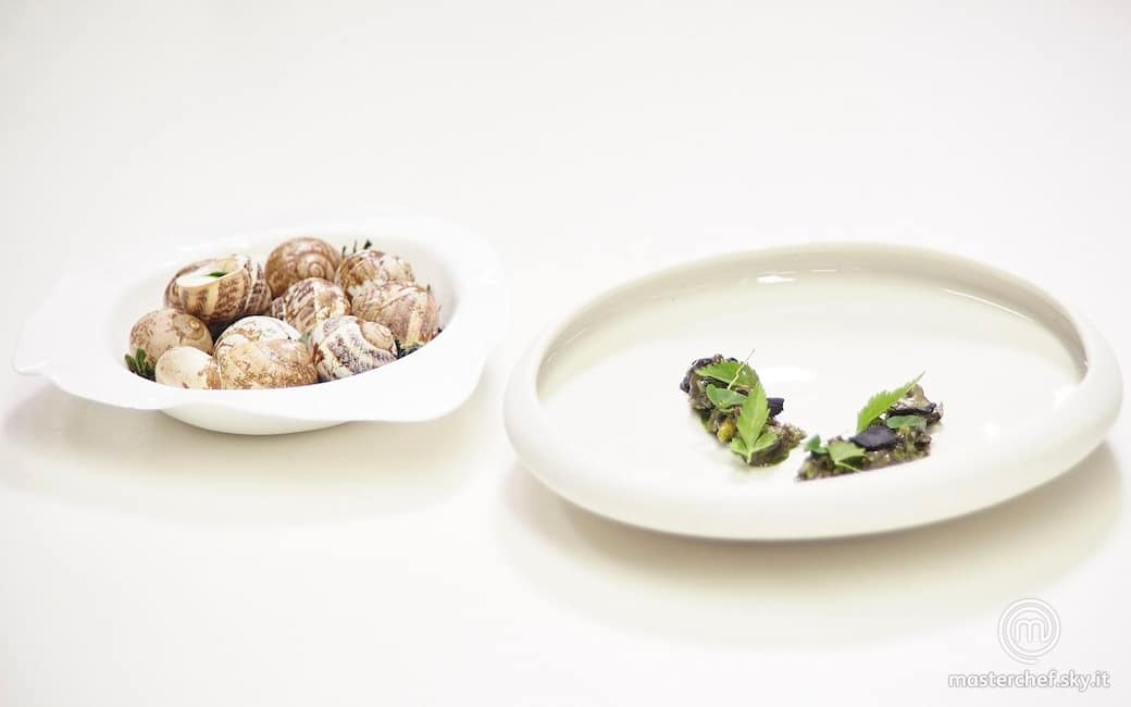 Per la crema di bieta: tolto le coste bianche dalla bieta, sbianchire le foglie, congelare in abbattitore e passate al Pacojet con mezzo spicchio d’aglio privato dell’anima e sbianchito tre volte. Emulsionare con olio di semi di vinacciolo, sale, un cucchiaino di mascarpone. Passare al setaccio. Per le lumache: ottenere la clorofilla di prezzemolo frullando quest’ultimo con poca acqua e filtrare con l’etamina. Spurgare le lumache in acqua fredda corrente per qualche ora, passarle con un canovaccio per pulirle dalla terra. Nel frattempo, preparare un fondo facendo rosolare il lardo e scalogno tritati con 20 ml di olio di semi di vinacciolo. Una volta pronto aggiungere le lumache e farle insaporire, sfumare con vino bianco e coprire con acqua e la clorofilla di prezzemolo e lasciar cuocere per 3 ore circa. Aggiustare di sapore.