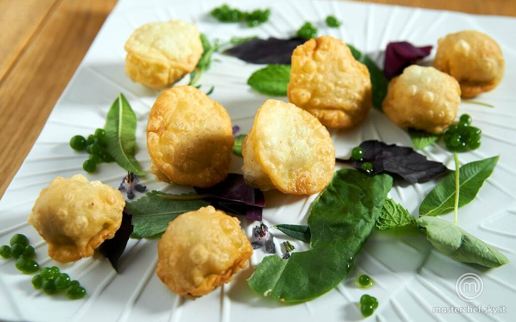 Recuperare l’impasto e tagliarlo formando dei quadrati. Farcire i quadrati con il burro montato, le lumache condite e coprire con un altro strato di burro montato. Ricavare dei dischi di sfoglia con un coppapasta (3/2,5 cm di diametro) e chiudere a raviolo. Friggere i ravioli nell’olio bollente; scolare su carta paglia.