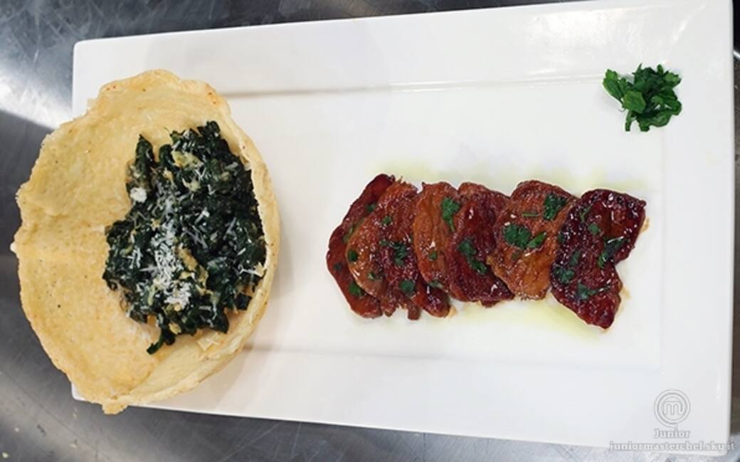 In una padella far sciogliere il burro e aggiungerci gli spinaci con il parmigiano restante. aggiustare di sale e, dopo averli fatti appassire utilizzare gli spinaci per riempire il cestino.