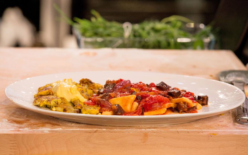 Maltagliati al pomodoro con frittata e crema alle mele