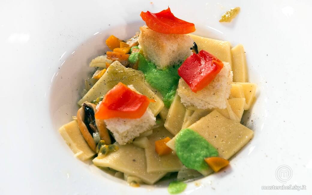 Portare a ebollizione abbondante acqua in una pentola e cuocere i maltagliati per qualche minuto. Scolare e versare la pasta nel sugo di cozze, saltandola un paio di minuti a fiamma vivace. Impiattare disponendo i maltagliati in un cappello del prete con qualche goccia di crema ai fagiolini, qualche seme di passion fruit, i quadrati di peperone e il pane tostato. Aggiustare di olio evo, sale e pepe.