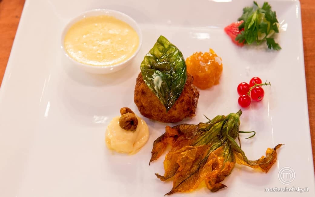 Impiattare disponendo una pallina di primosale al mango e agrumi con la listarella di fungo attorcigliata e una di confettura al mango. Interporre tra di esse il cervello fritto con una foglia di basilico fritta, il fiore di zucca fritto e la maionese smontata al pompelmo rosa in una ciotolina. Completare con un spicchio di lime, dai triangoli di pompelmo rosa e le erbe aromatiche.