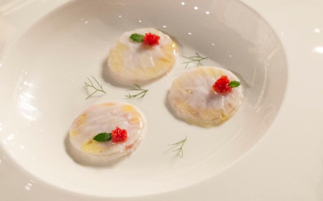 Impiattare disponendo tre dischi di seppia, spalmarli con il gel al ribes e sovrapporvi altri tre dischi. Posizionare sui ravioli mezzo cucchaino di caviale rosso e una fogliolina di menta e irrorare con olio evo. Decorare con qualche foglia di aneto. Accompagnare con il brodo di funghi porcini servito in una salsiera a fianco al piatto.