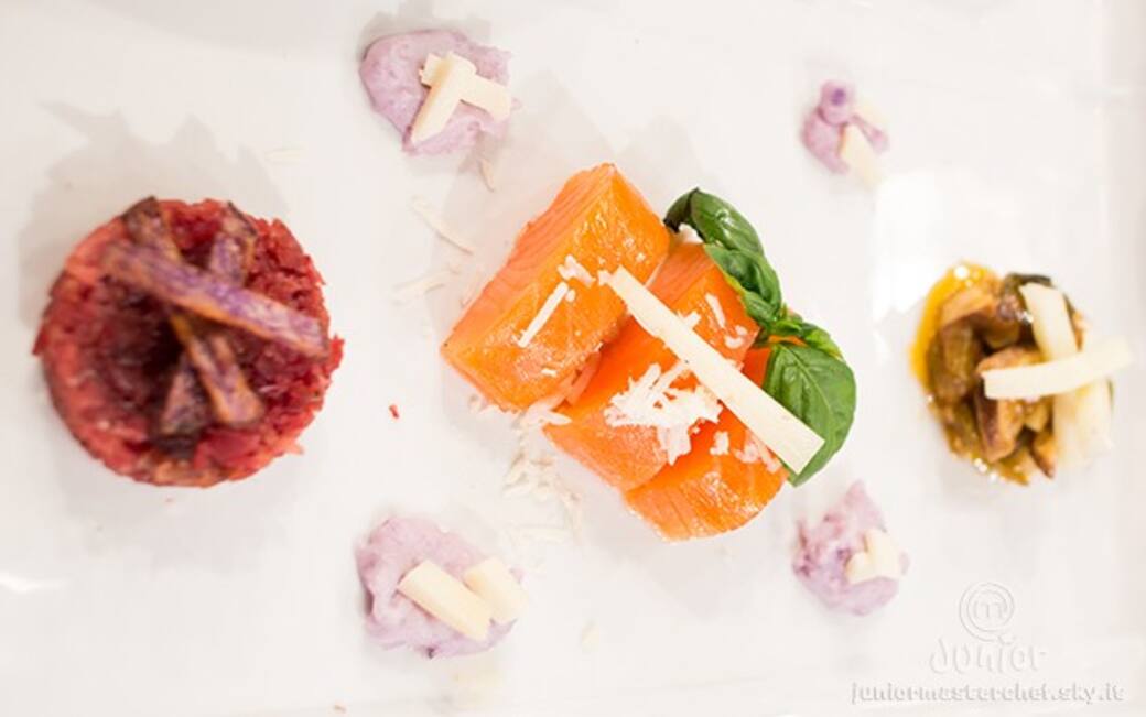 Lessare le patate, preparare il pure con la ricotta e un tuorlo d’uovo, tagliare il salmone in piccoli pezzi tipo sushi, grattugiare il pecorino, aggiungervi le erbe (basilico e timo) e lasciare riposare 20 minuti.