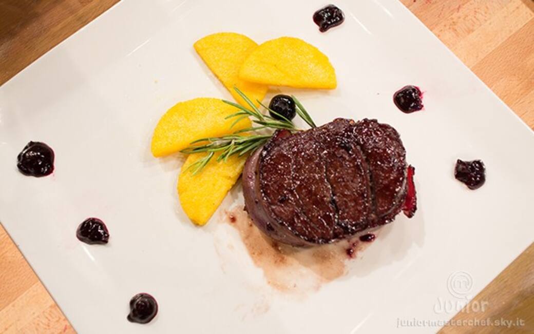 Medaglione di filetto in salsa di mirtillo e chips di polenta