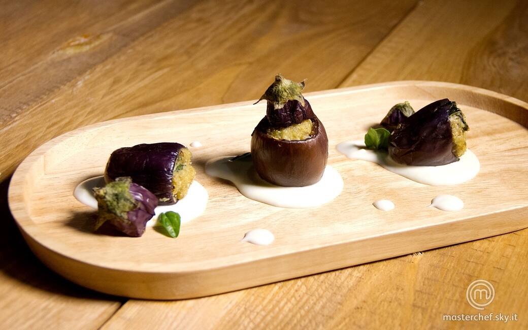 Mettere a bollire le tre melanzane in acqua non salata per circa 8-10 minuti fino a farle ammorbidire leggermente. Selezionare le foglie più belle e larghe di basilico e tenere da parte. Scolare le melanzane e tagliare la parte superiore in corrispondenza del picciolo. Scavarne l’interno con un cucchiaino, mettendo da parte la polpa in una boule.