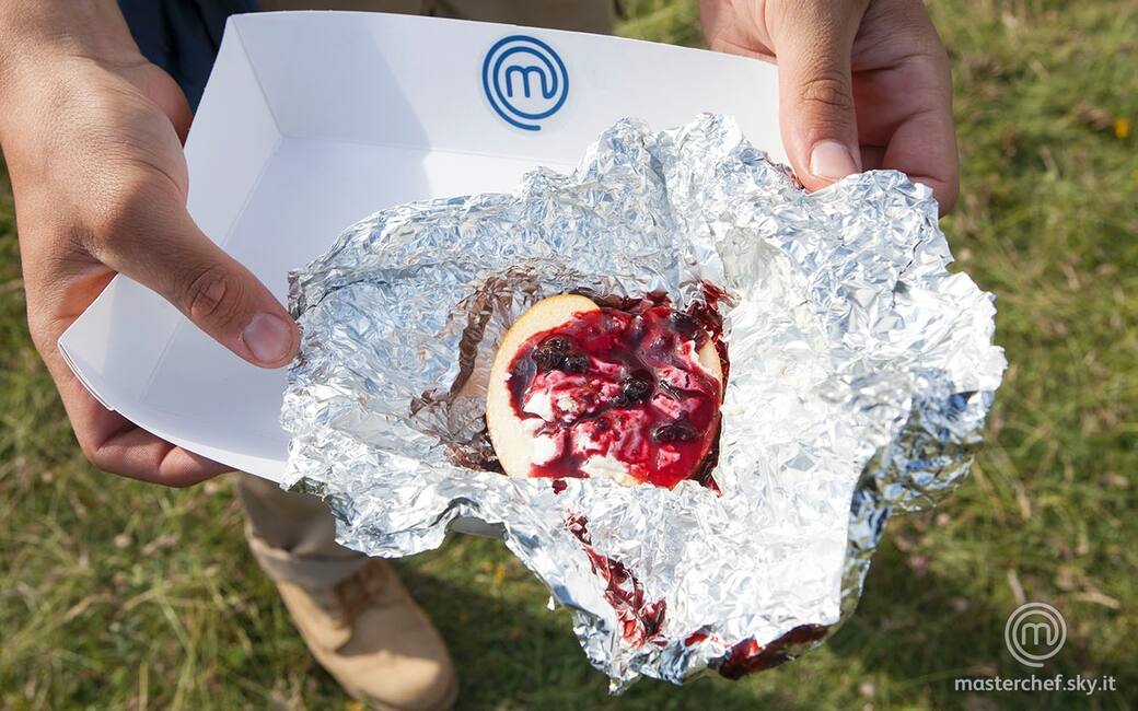 Riempire le mele con la crema alla ricotta, avvolgere nella carta allumino e cuocerle sulle braci ardenti per circa 10-15 minuti.