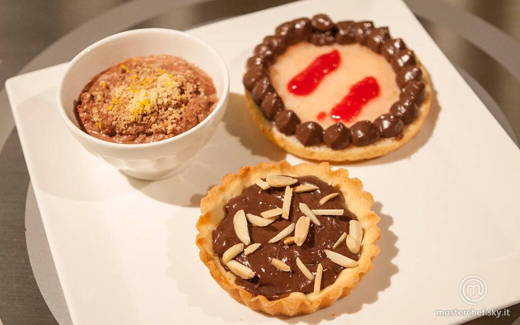 Tostare le mandorle in padella e tagliarle a metà. Farcire la tartelletta con la crema al cacao e all’arancia e decorare con le lamelle di mandorle. Versare la mousse in una ciotolina grattugiarvi sopra la scorza dell’altra metà di arancia e un piccolo pezzo di frolla sbriciolata. Coppare il pan di spagna con l’ausilio di un ring circolare, bagnarlo su un lato con la crema al cioccolato bianco e la coulis di lamponi e decorare con l’ausilio di una sac à poche con la crema al cacao.