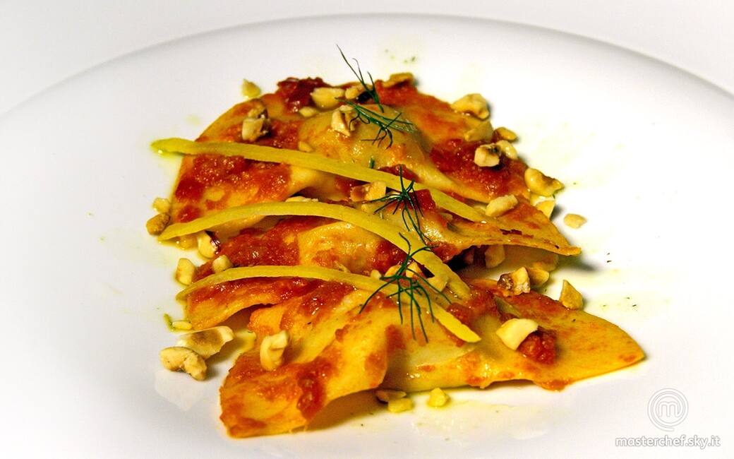 Creare un’emulsione frullando il finocchietto con sale, pepe e olio evo. Tenere del finocchietto da parte. Tagliare la scorza di limone a julienne e passarla nei 3 pentolini a bollore per pochi istanti, poi freddare e fermare il colore in acqua e ghiaccio. Far soffriggere in una padella lo scalogno già tritato con un filo d’olio evo. Tritare i pomodori secchi e aggiungerli al soffritto, insieme alla passata di pomodoro.