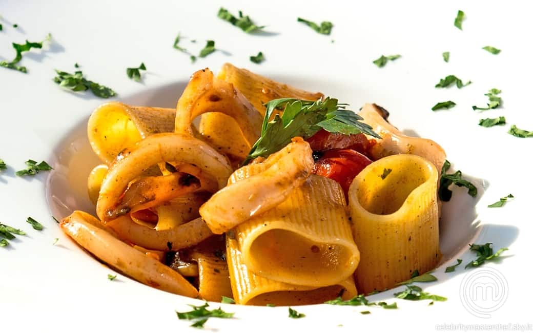Portare a ebollizione abbondante acqua salata e cuocere i paccheri. scolare al dente e saltare i paccheri nel sugo di calamari.