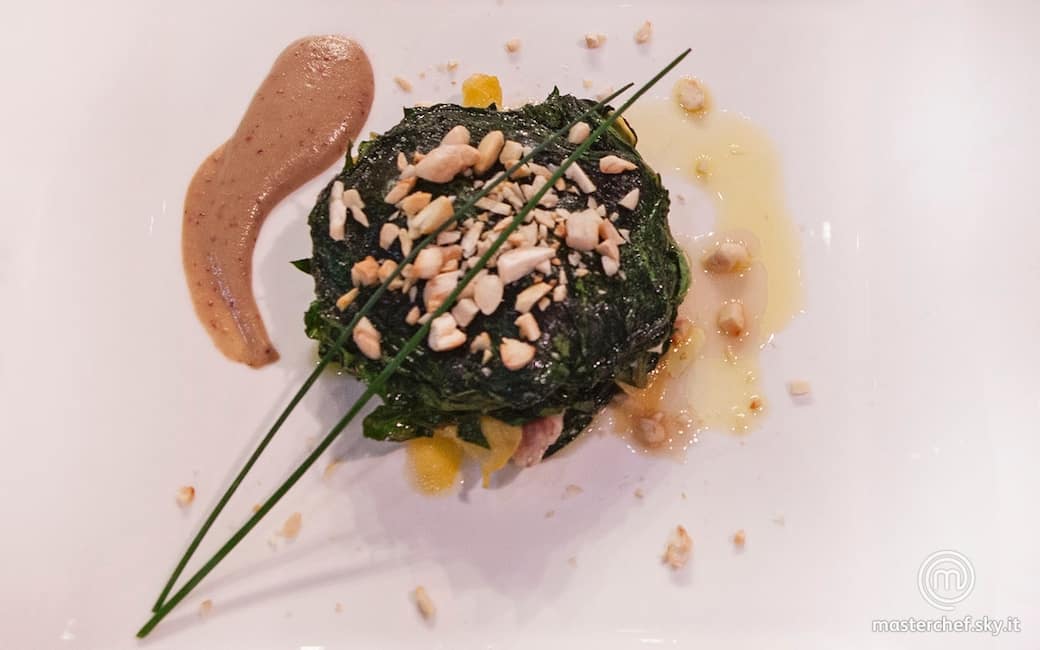 Impiattare disponendo il tortino al centro del piatto, aggiungere le mandorle tritate e un cucchiaio di salsa alle fave e alle fragoline. Aggiustare di olio, sale e pepe.