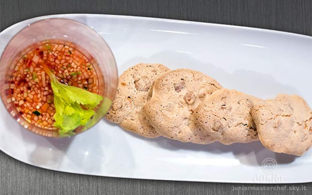 Servire in tazzina o bicchiere trasparente con dentro un velo di ciuffo di finocchio o ciuffo di sedano con qualche brutto ma buono di accompagnamento