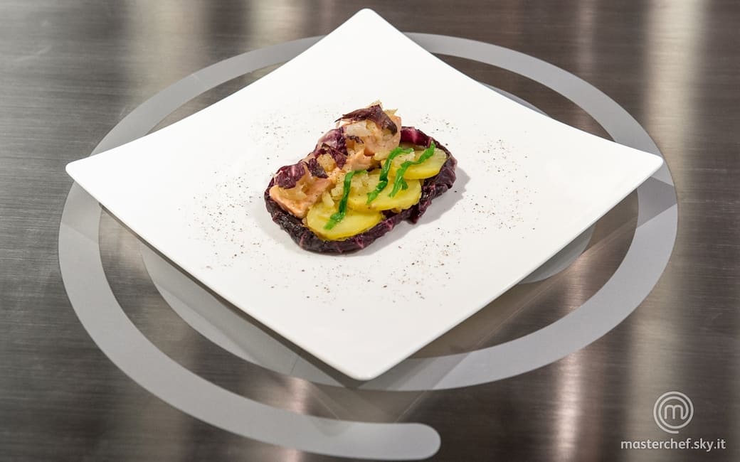 Impiattare disponendo una foglia di radicchio intera sul fondo, il filetto di salmone e le patate a fette. Concludere decorando con le listarelle di radicchio e foglia di rapa bianca.