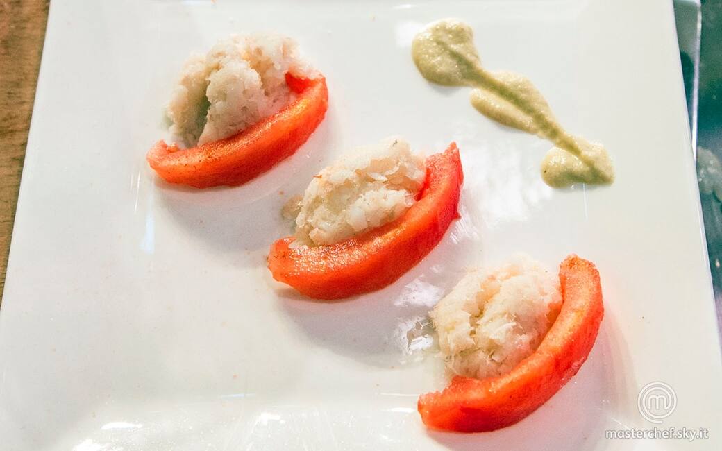 Portare a ebollizione l’acqua in una pentola, sbianchire i pomodori e passarli in acqua e ghiaccio. Privarli della buccia e far raffreddare. Una volta raffreddati tagliare i pomodori in 4 per il senso della lunghezza, privarli dei semi e marinarli con una emulsione di paprika e acqua.
