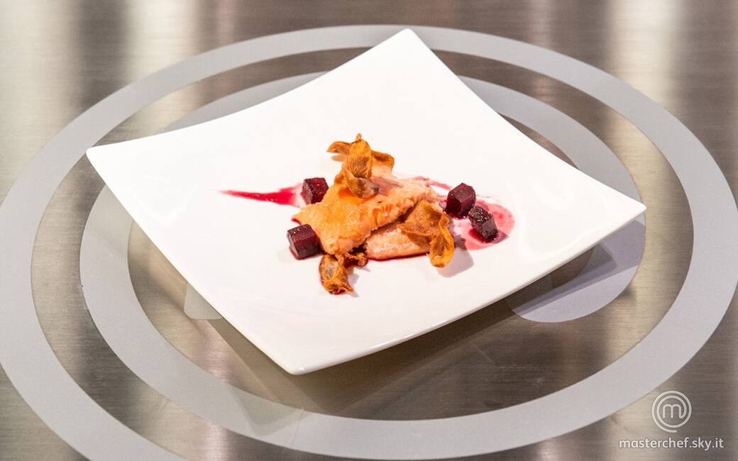 Impiattare ponendo sul fondo di un piatto una pennellata di succo della rapa rossa caramellata, adagiare i tranci di trota, qualche dadino di rapa rossa e le chips di topinambur. Aggiustare di sale e pepe.