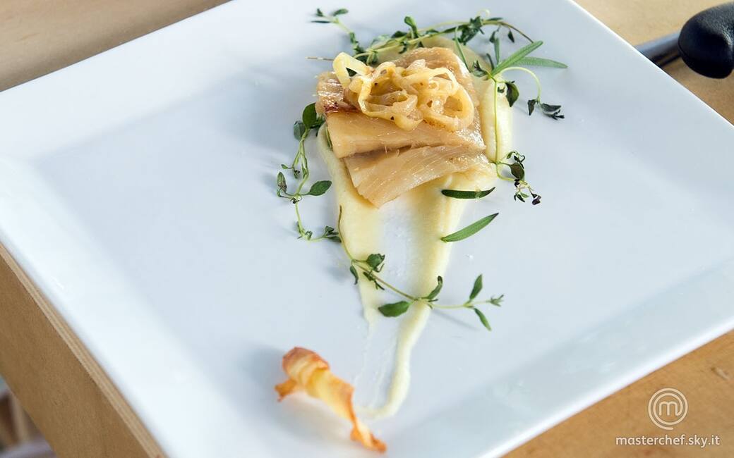 Impiattare disponendo la crema di patate e sedano rapa, il trancio di stoccafisso con le cipolle utilizzate per la sua cottura e due chips di daikon.