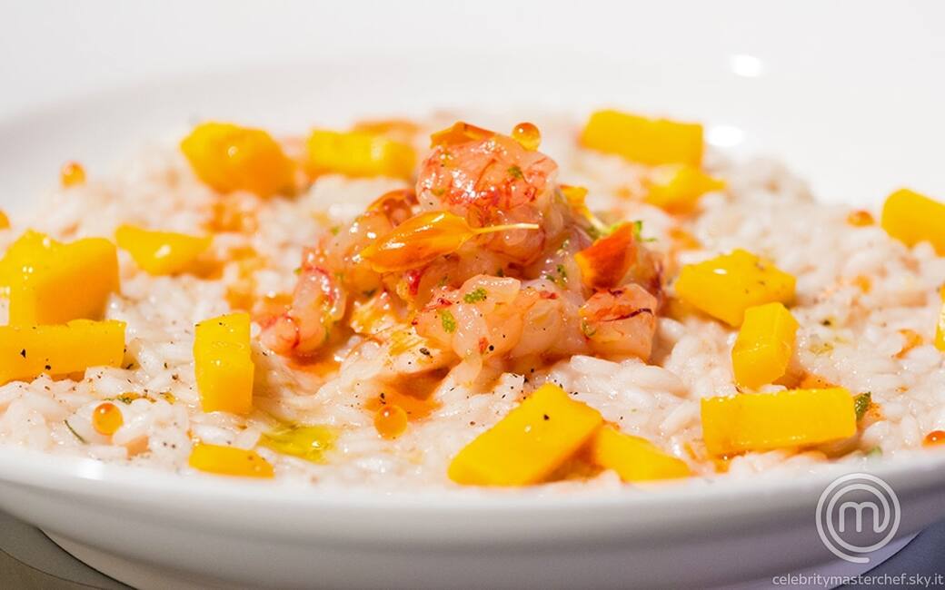 Distribuire il risotto nei piatti e adagiare al centro i gamberi marinati e la guancia della ricciola a pezzetti. distribuire sopra il mango, completare con una macinata di pepe e guarnire con i fiori eduli.