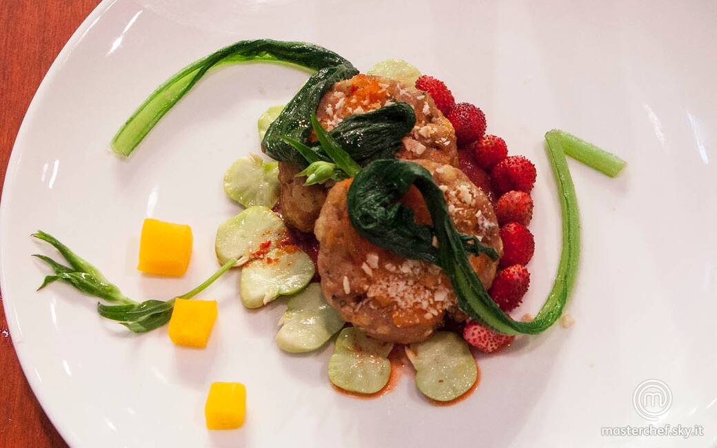 Impiattare disponendo la crema di fragoline, le polpette di carne, le fave e i cubetti di carota. Completare con le fragoline rimaste a crudo, una foglia di silene e aggiustare di sale e pepe.