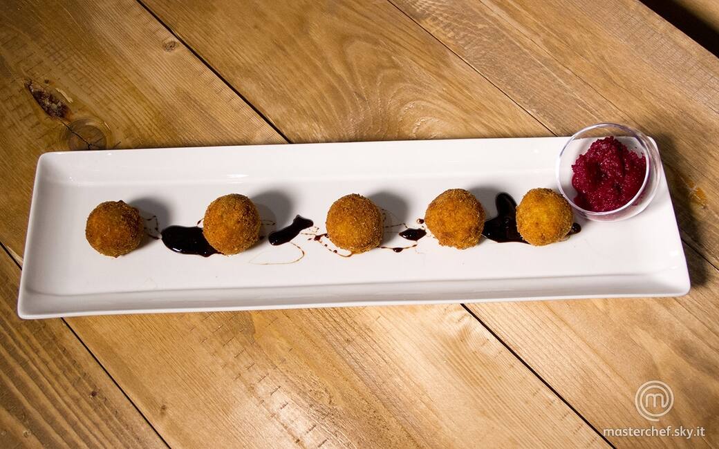 Olive all’ascolana con ripieno al formaggio, ketchup di barbabietola e riduzione al balsamico