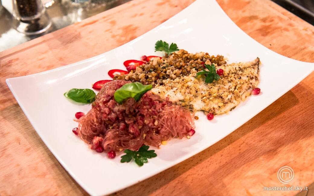 Pulire, eviscerare e sfilettare l’orata, rimuovendo eventuali spine rimaste dai filetti. Condirli con olio evo, sale, pepe, un rametto di rosmarino e un trito di noci e infornarli a 180 °C per 10 minuti. Nel frattempo, cuocere i noodles nell’acqua di cottura delle lenticchie per 5 minuti e tagliare in due e sgranare la melagrana.