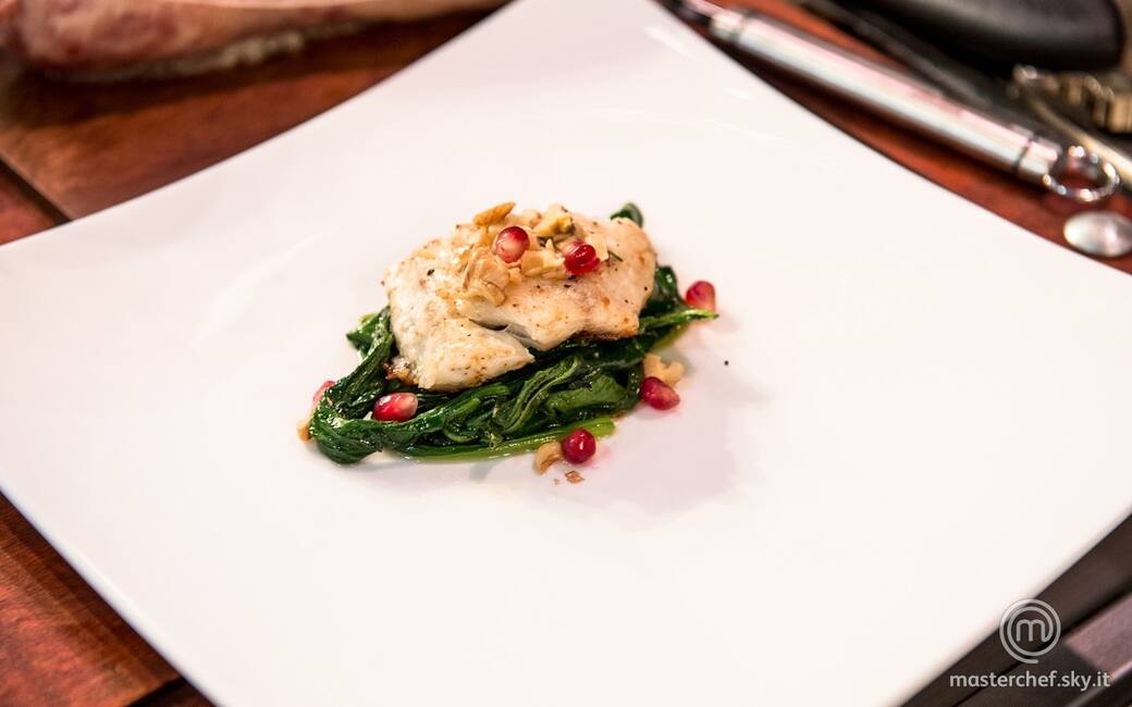 Adagiare sul piatto il letto di bietola, successivamente posizionare una quenelle di crema di lenticchie. Appoggiarvi sopra il filetto di orata e guarnire con noci tostate e melagrana in semi.
