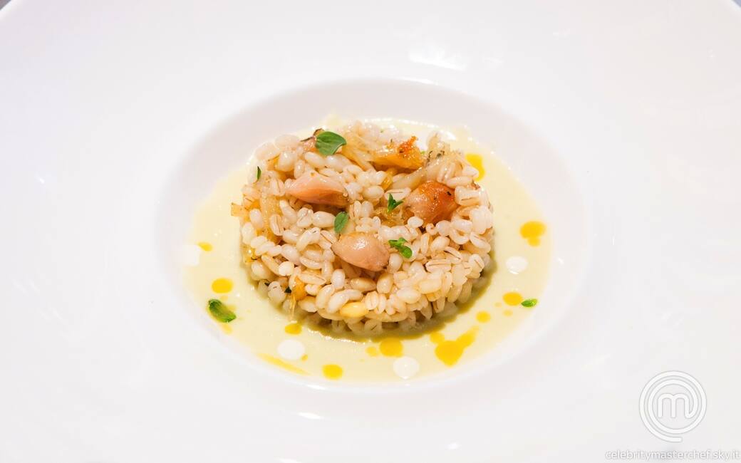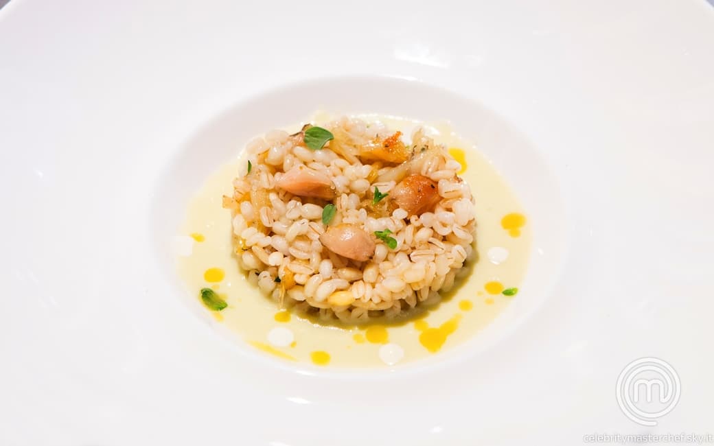 Sbucciare gli scalogni e tritarli finemente, poi farli soffriggere in un tegame con un filo d’olio. unire l’orzo ben sciacquato, mescolare, bagnarlo con poco vino, quindi versare un mestolo di brodo di rane molto caldo. portare a cottura l’orzo come un risotto in 25-30 minuti, versando man mano altro brodo caldo e mescolando spesso.