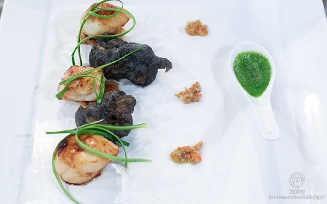 Ostriche al nero di seppia, capesante e buonauscita di zucchine