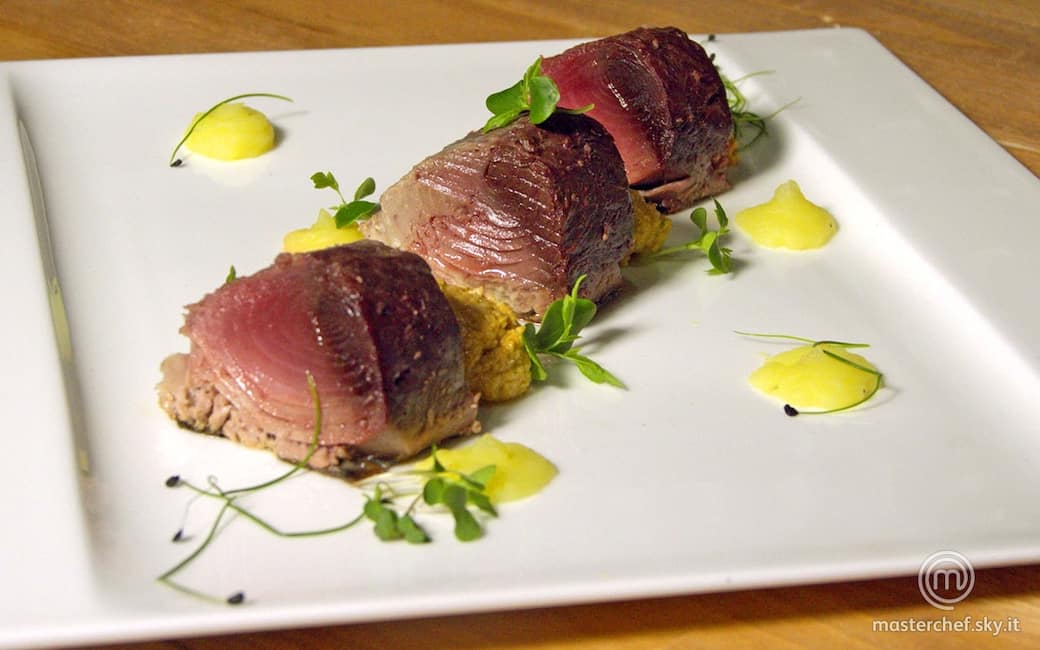 Sfilettare la palamita e ricavare un filetto. Mettere il filetto in una padella con un foglio di carta forno, aggiungere un filo di olio evo e scottarlo dalla parte della pelle. Cuocere con un coperchio per pochi minuti. Parare il filetto e ricavarne tre trancetti uguali.