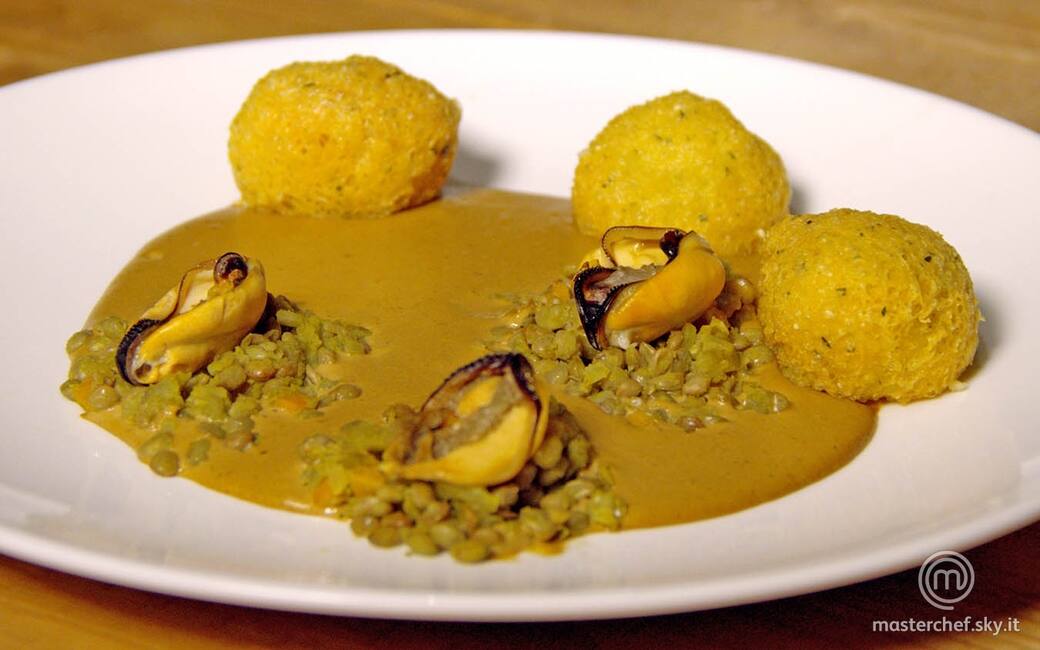 Pallotte “cacio e ova” con vellutata di cozze e lenticchie