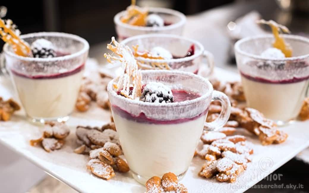 Per la panna cotta: mettere a mollo, per alcuni minuti, i fogli di colla di pesce. tagliare in piccoli pezzi il cioccolato bianco e scioglierlo in una pentola a bagno maria. unire al cioccolato sciolto la panna e 80 grammi di zucchero. mescolare bene e unire anche la colla di pesce ben strizzata. amalgamare fino ad ottenere un composto omogeneo, liscio e senza grumi. versare il composto cosi ottenuto nei bicchierini e riporre in frigo per 4/5 ore.