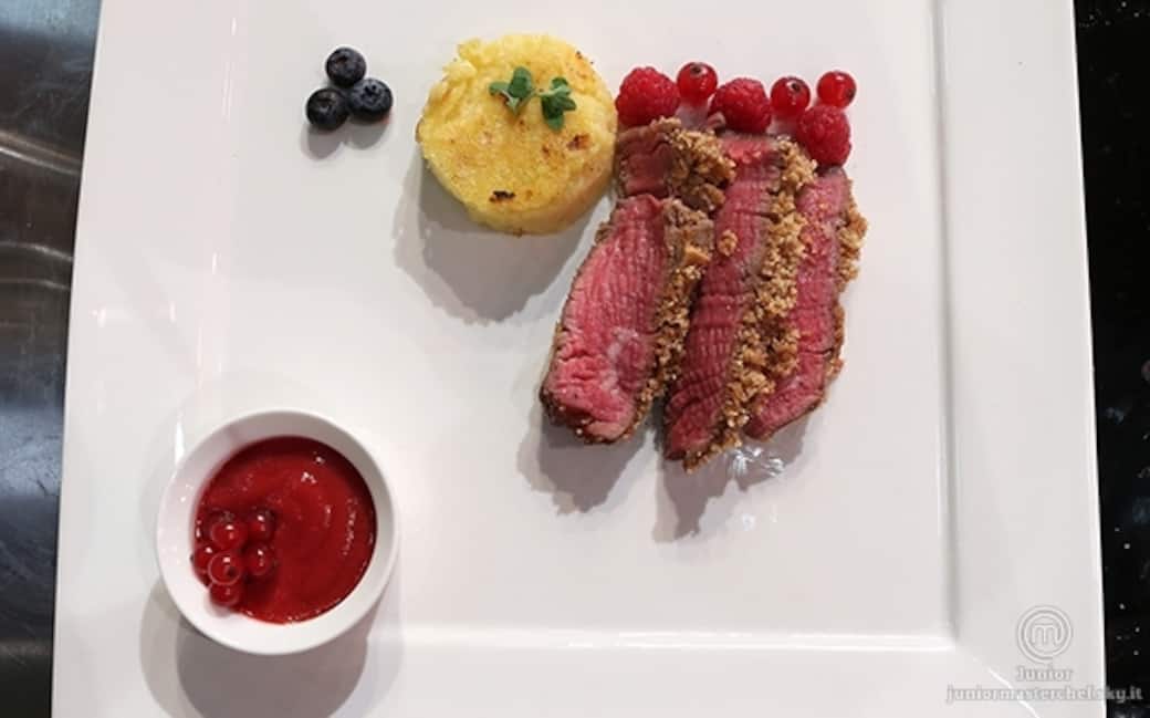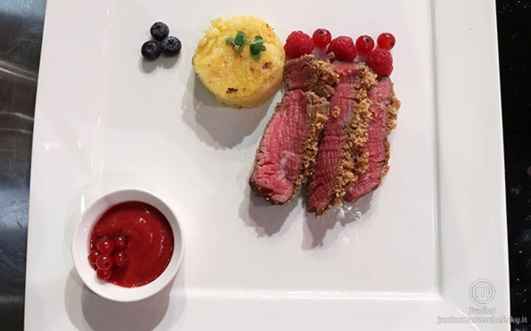 Mescolare i frutti di bosco (lamponi, ribes, more e fragole) con dello zucchero ed un po' di succo d'arancia e servire in una coppetta a parte per guarnire il piatto.