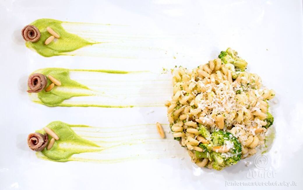 Condire la pasta con i broccoli, le acciughe e la crema di broccoli.