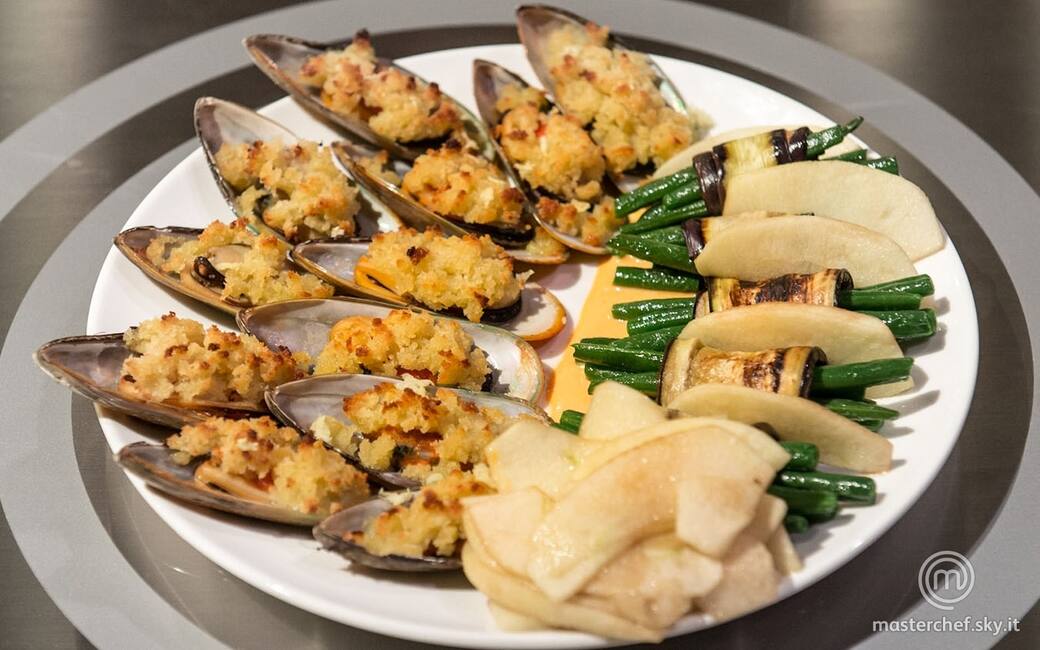 Sbriciolare la mollica di pane e condirla con olio evo, sale e pepe. Spolverarla sopra le cozze e infornarle a 200 C° in modalità grill per 10 minuti.