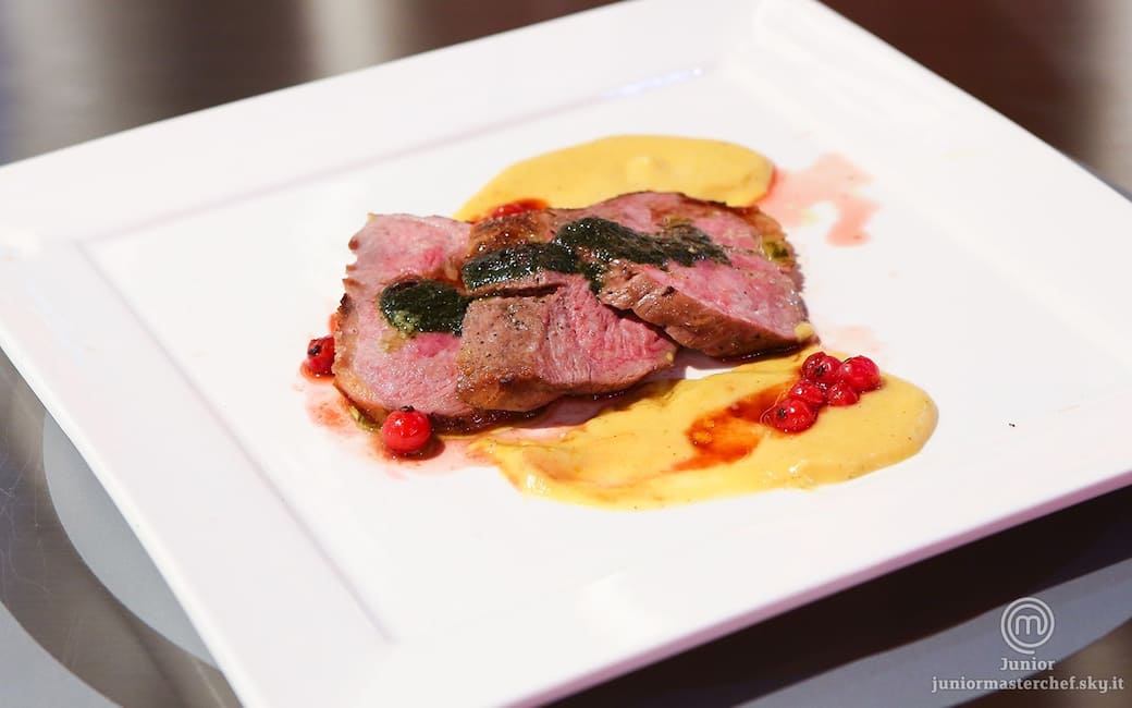 Petto d'anatra con purè di mango e alloro