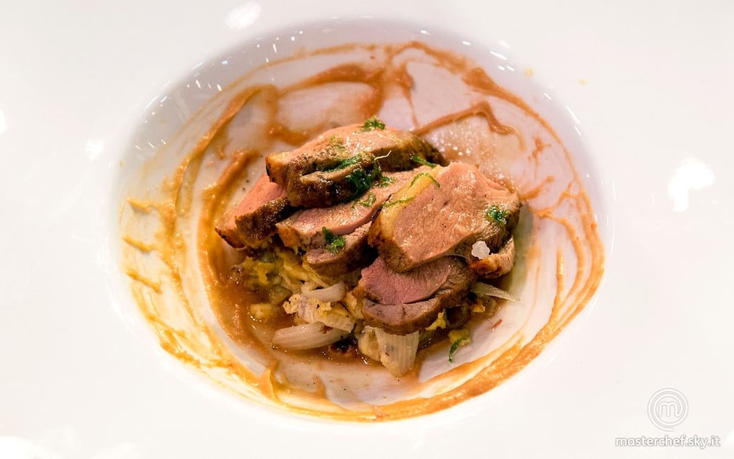 Impiattare “sporcando” il fondo di un cappello del prete con la salsa al guacamole rossa. Adagiare sul fondo i cipollotti alla cantonese e le fette di petto d’anatra, irrorare con la salsa agli scampi e coriandolo e completare con qualche fiocco di sale e una grattugiata di scorza di lime.