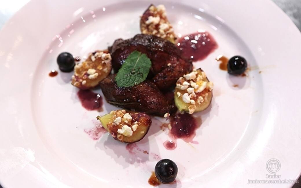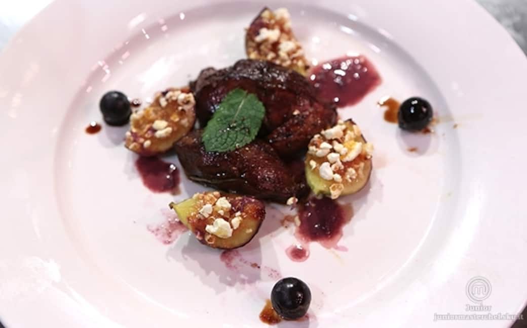 Impiattare disponendo a croce al centro del piatto i due petti di piccione. all'estremita posizionare i fichi con i pop-corn. irrorare il piccione con la saba. partendo da centro del piatto formare una spirale che si allarga con la salsa alla uva fragola.