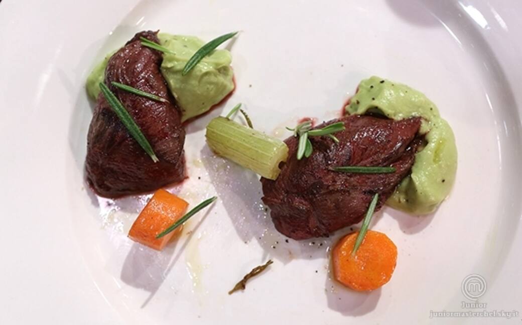 Servire il piccione accompagnato dalle verdure e quenelle di guacamole.