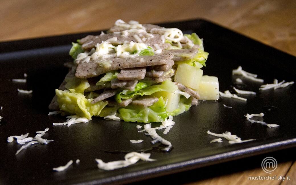 Pelare le patate (se possibile silane, o similari) e tagliarle a fette spesse e uniformi, in modo che cuociano in modo omogeneo. Salare l’acqua (circa 10 g per ogni litro) e immergere le patate (dopo 2’ circa va aggiunta la verza). Pulire la verza, sfogliandola. Tagliarla a metà, quindi farla a fette eliminando la parte coriacea. Immergere anch’essa nell’acqua a bollore con le patate. Lasciare a cuocere per circa 4’.