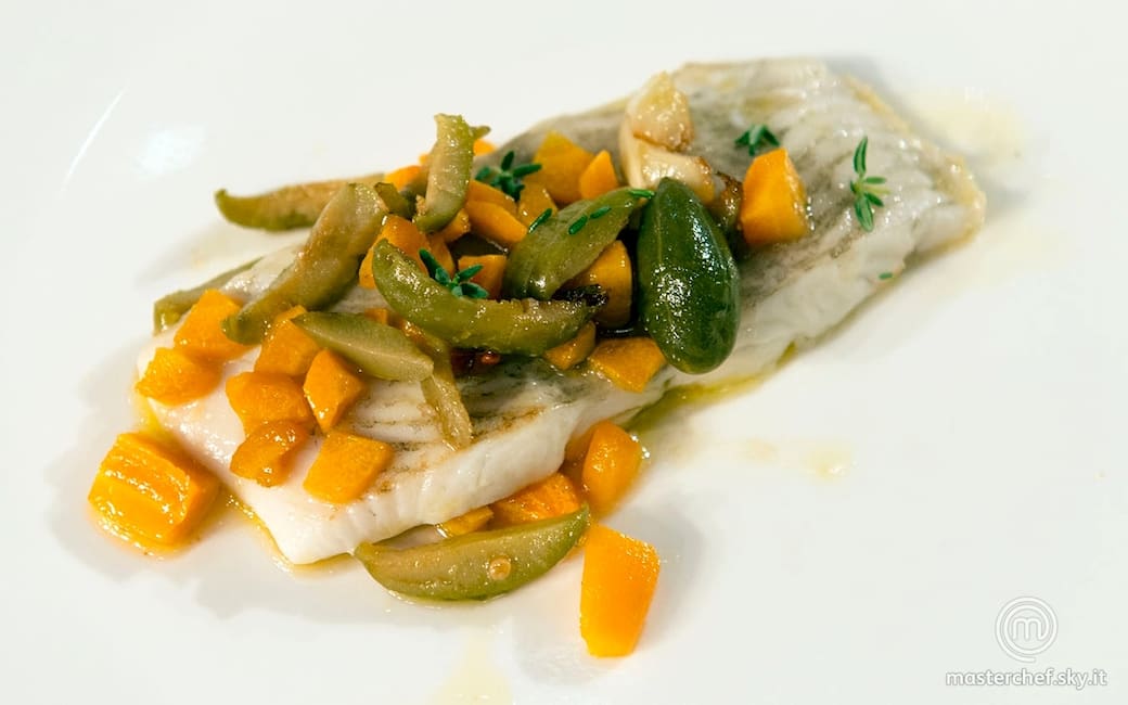 Impiattare in un piatto piano la platessa sotto e le verdure sopra. Aggiustare di sale e pepe e decorare con foglie di maggiorana.